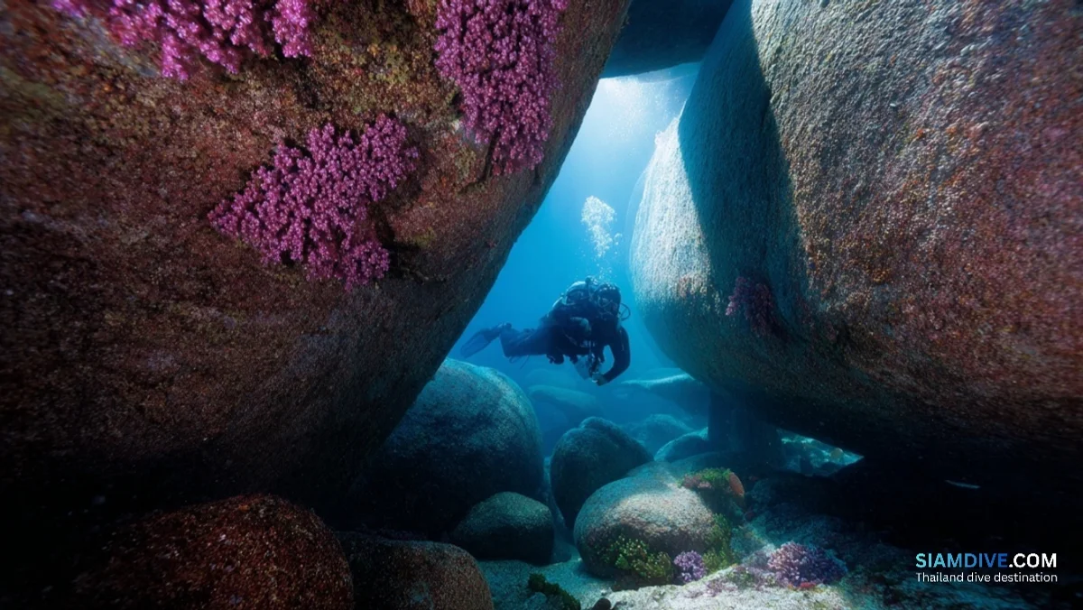 거인이 던진 주사위가 공중에서 멈춘 장면을 상상해 보세요. 작은 집 크기의 바위들이 다양한 각도로 쌓여 있고, 그 사이로 두 명이 나란히 지나갈 수 있는 터널부터 한 명만 겨우 통과하는 좁은 틈까지 다양한 통로가 형성되어 있습니다. 바위 틈 사이로 내려오는 푸른빛 광선이 분홍색과 보라색 연산호로 덮인 천장을 비춥니다.